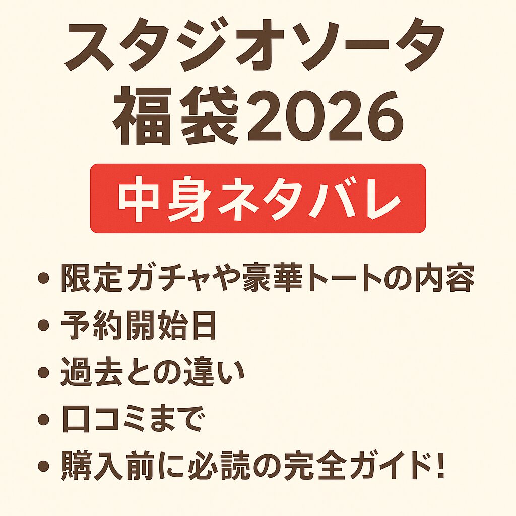 2026年も大注目!スタジオソータの福袋が話題になっていますね。 毎年、限定カラーのガチャや豪華トートバッグが入っていて、SNSでも「中身が神すぎる!」と話題になるスタジオソータの福袋。「予約はいつ?」「中身のネタバレが知りたい!」「今年はどん... -